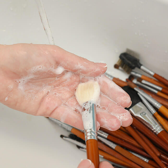 Pour a drop of baby shampoo into some lukewarm water and swirl with your makeup brushes. Place a drop of your cleanser of choice into the palm of your clean hand. Let dirty brushes soak for a minimum of 10 minutes.